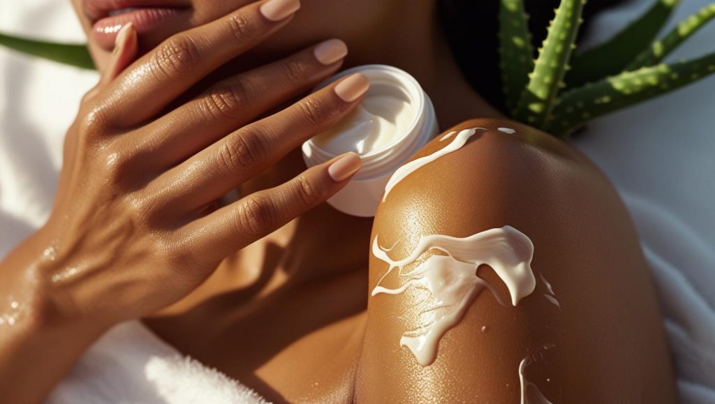 - De l’extérieur : Appliquez quotidiennement un soin hydratant adapté à votre type de peau. Optez pour des crèmes ou laits riches en ingrédients naturels comme l’aloe vera, le beurre de karité ou des huiles végétales légères. Une peau souple et hydratée résistera mieux aux agressions extérieures et aura un plus joli hâle.
